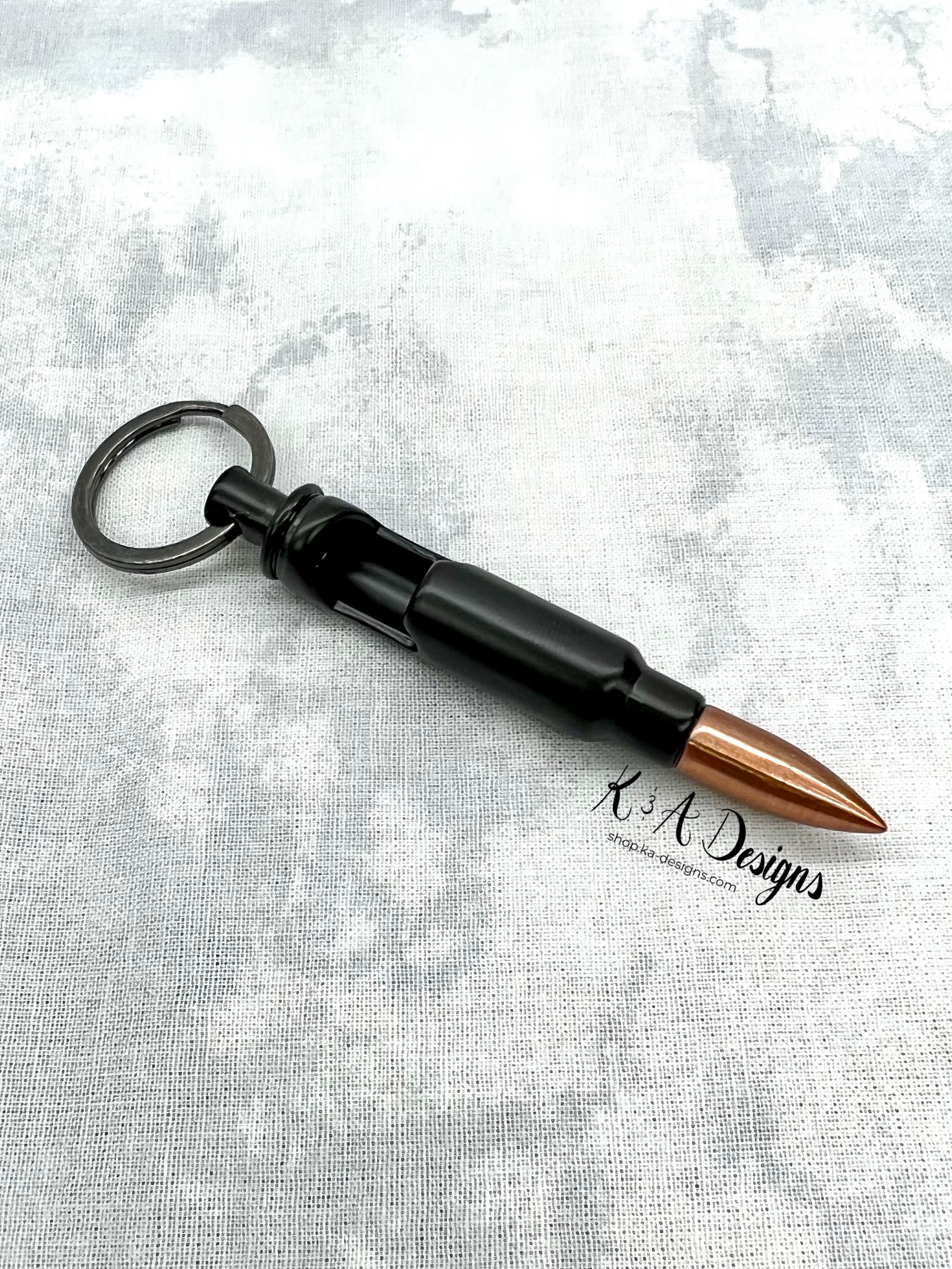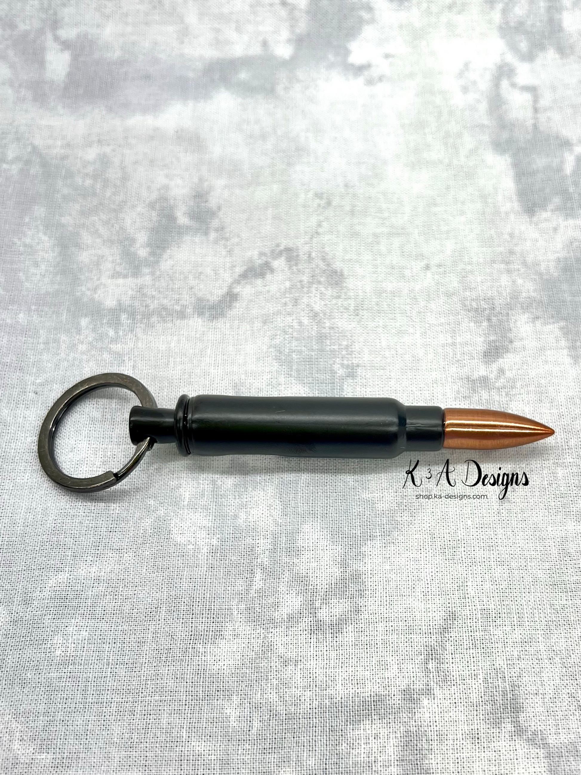 Zinc alloy bullet bottle opener keychain. Replica .308 shell with imitation bullet. Approximately length without keyring: 3.2"