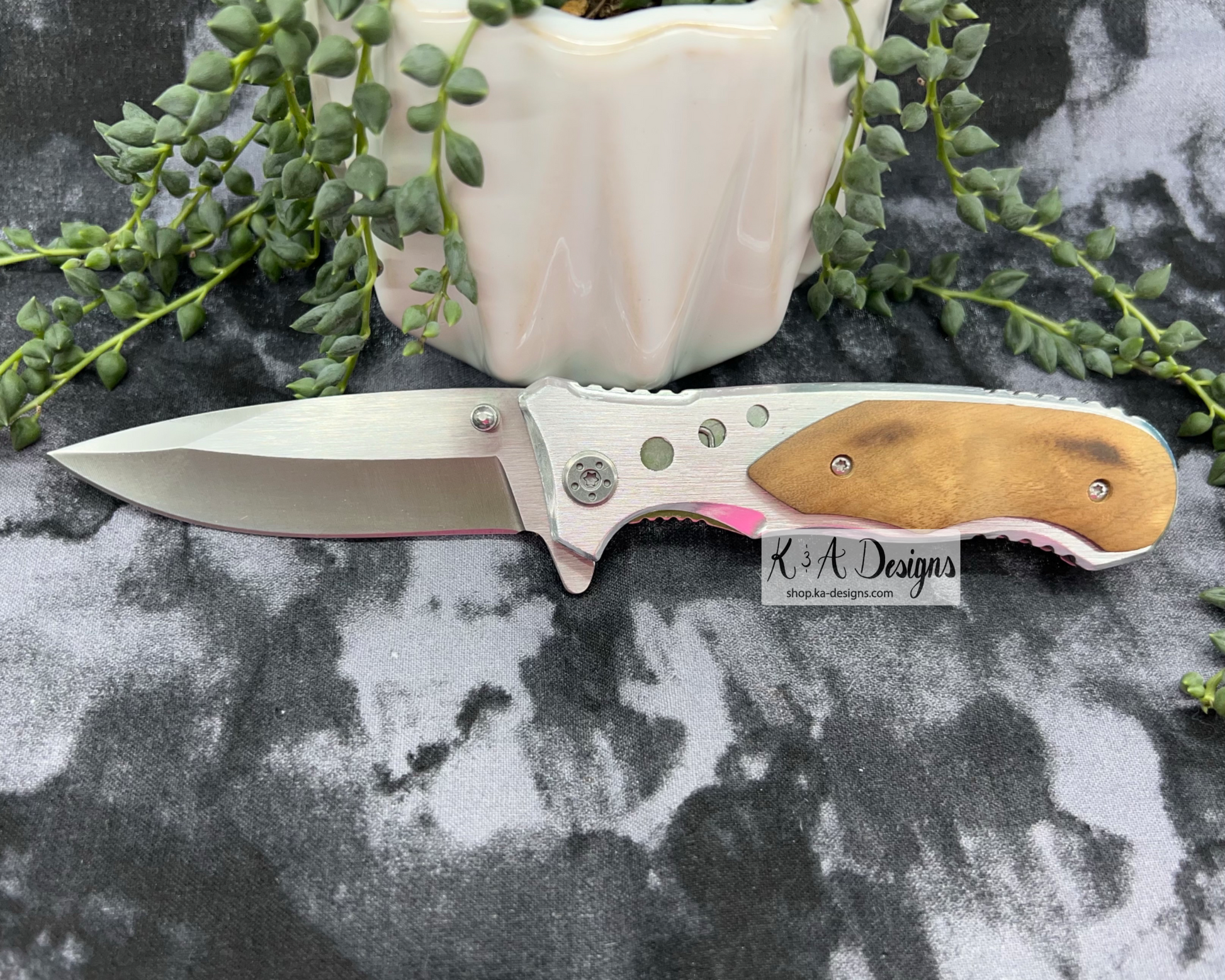 These make the perfect personalized gifts! The handle is made of olive wood (one side) and can be engraved on the front. The blade is made of stainless steel and can not be engraved.