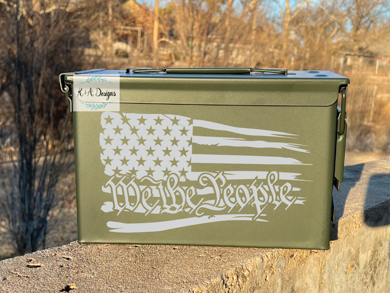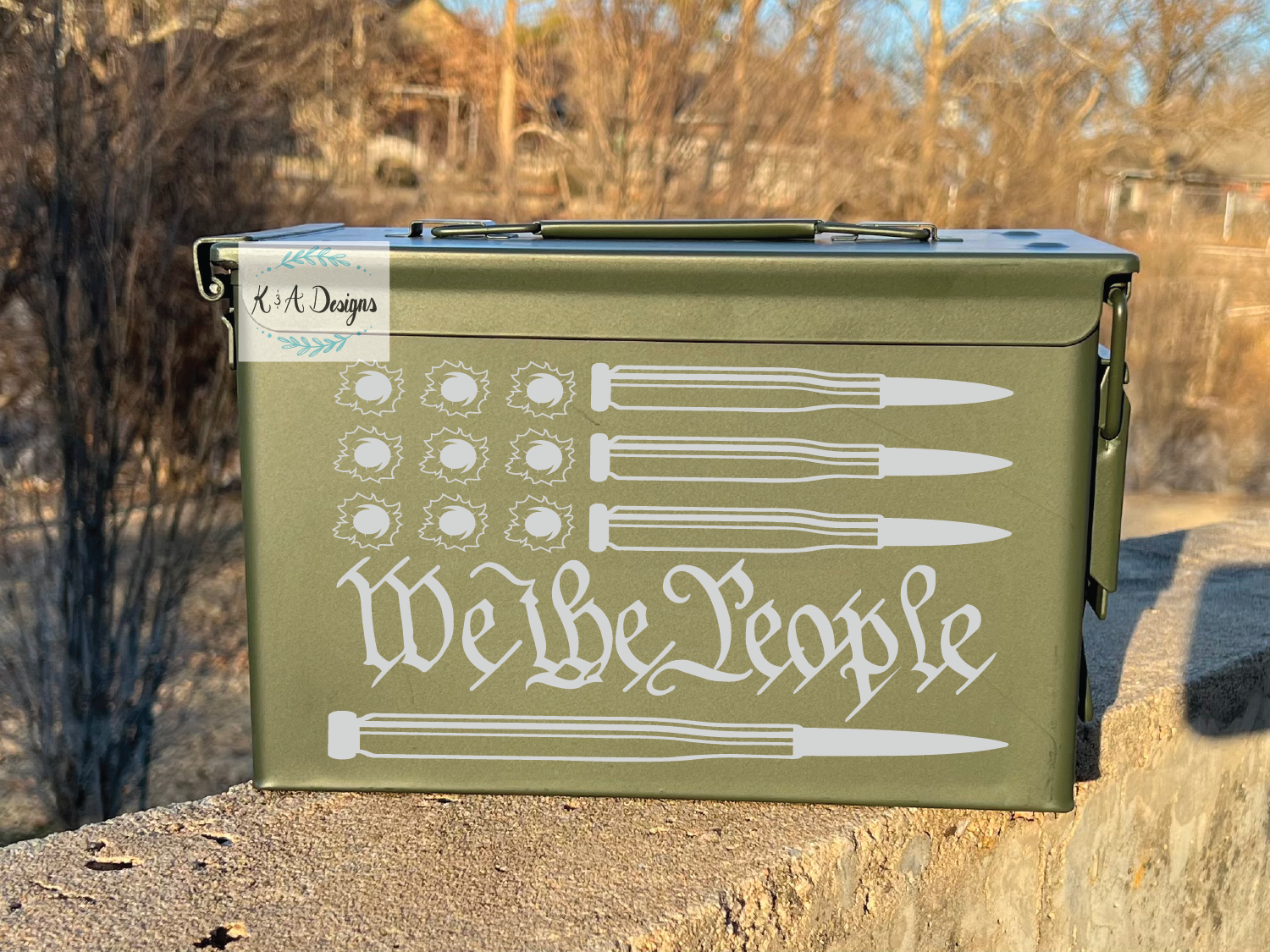 0.30 caliber ammo can dimensions: 6" (w) x 3.5" (d) x 6.12" (h), 3.9 lbs, can hold 34 lbs 0.50 caliber ammo can dimensions: 11.1" (w) x 5.5" (d) x 6.9" (h), 5.6 lbs, can hold 34 lbs
