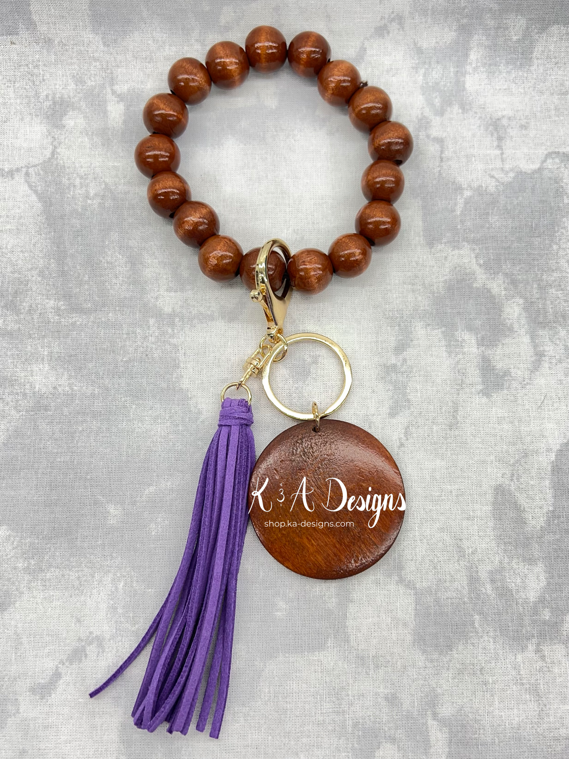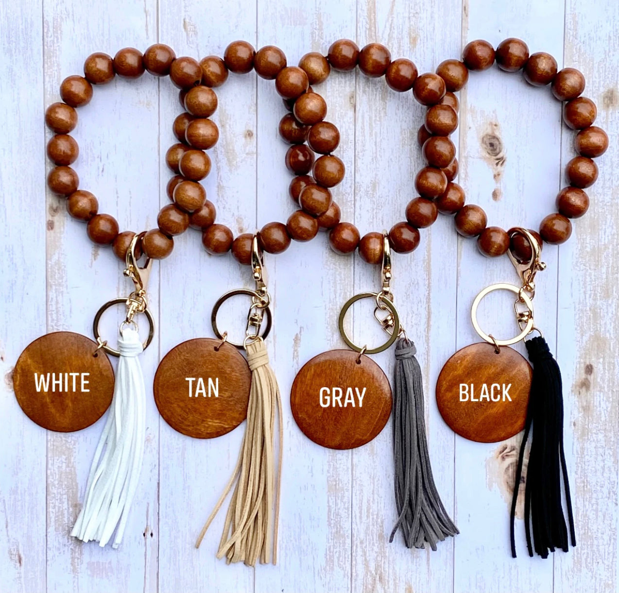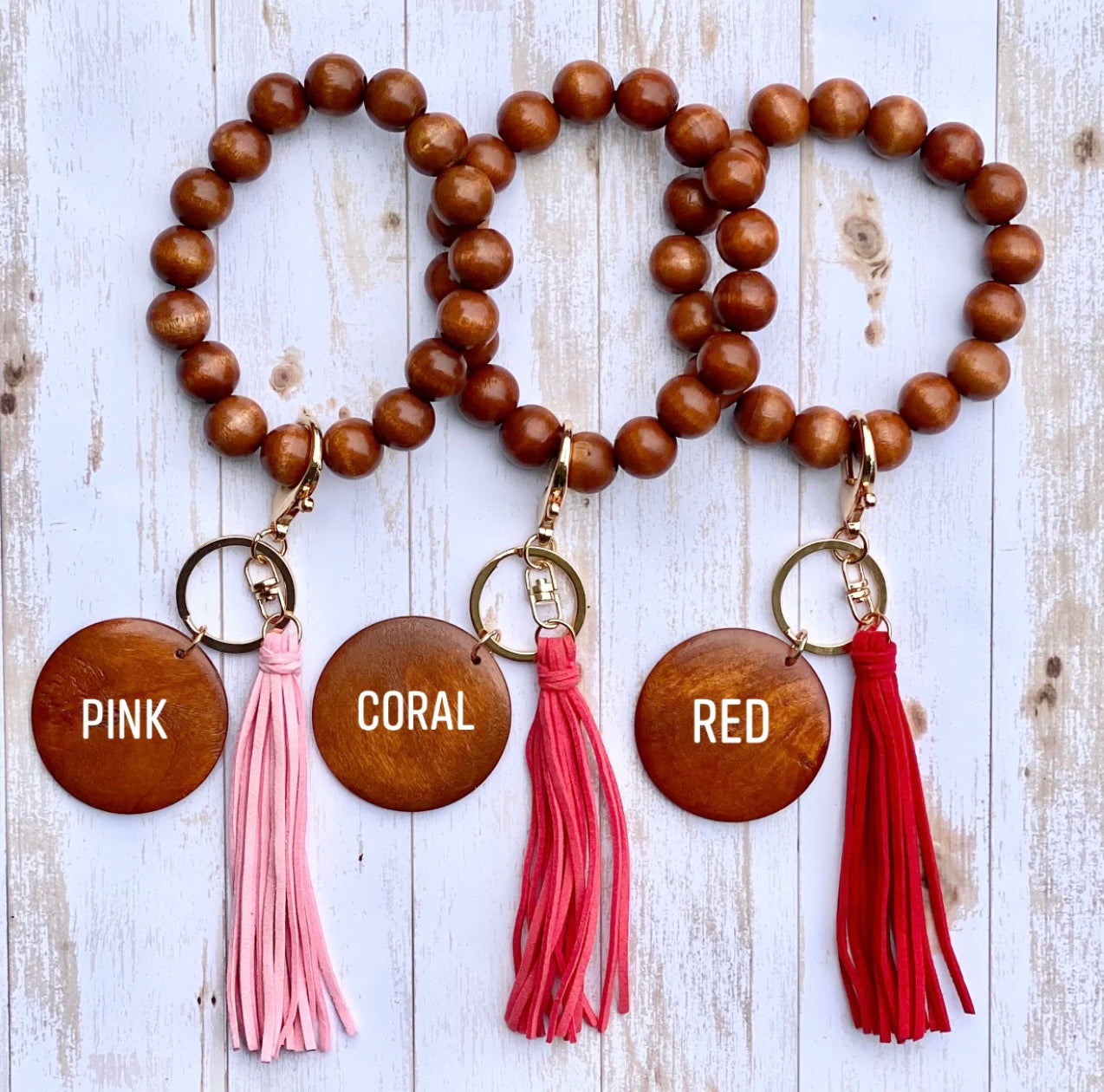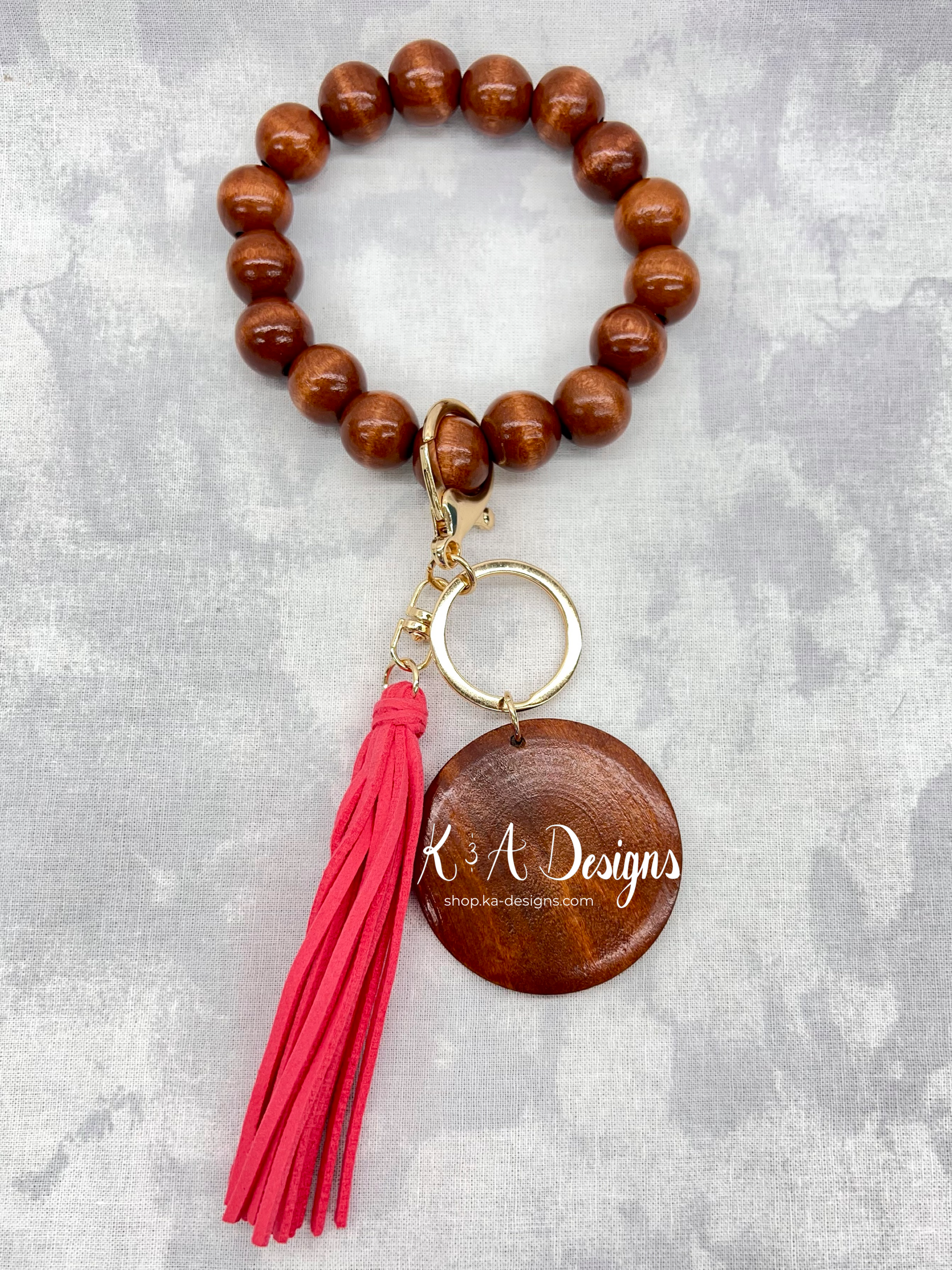 Each wristlet is made with wooden beads, suede tassel, and wood pendant. Wristlet is adorned with gold keyring and lobster claw clasp. Wristlet is made of a stretchy elastic band strung with 15mm wood beads. Wood pendant is approximately 2” and wood grain may vary. Wooden beads and pendant are made from genuine Chinese cherry wood and stained.